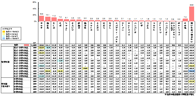 ラーメンは、特に1~3年生男子に人気で、焼き肉は3~6年生男子の約3割が好きと答えている。5・6年生女子は焼き肉よりハンバーグを好きな割合が高く、カレーライスは2年生女子の約3割近くが好きと答え、1年生女子はポテトフライを好きな子が2割以上いた。
