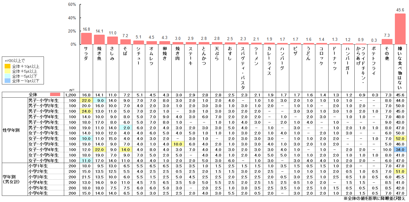 嫌いな食べ物の1位は「サラダ」(16.8%)で、2位「焼き魚」(14.1%)、3位「さしみ」(11%)と続き、いずれも昨年と同じ順位となった。