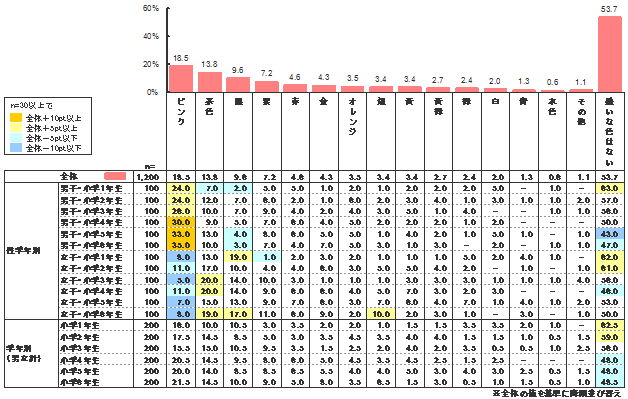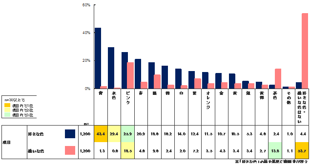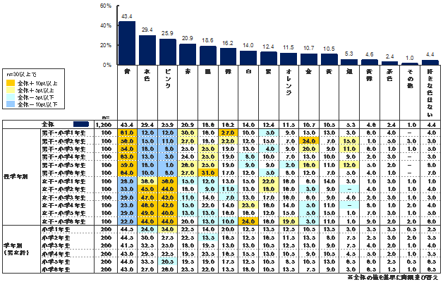 全学年男女の全体で、好きな色の1位は「青」(43.4%)、2位「水色」(29.4%)、3位「ピンク」(25.9%)、4位「赤」(20.9%)、5位「黒」(18.6%)となっている。