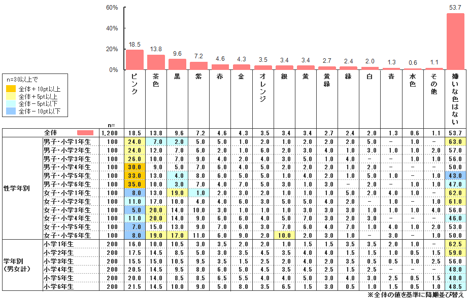 一方、全学年で嫌いな色は、1位「ピンク」(18.5%)、2位「茶色」(13.8%)、3位「黒」(9.6%)、4位「紫」(7.2%)、5位「赤」(4.6%)と続く。