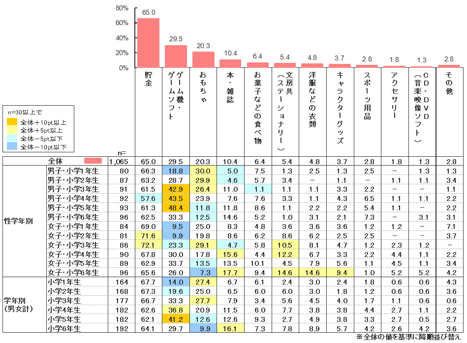 2位は「ゲーム機・ゲームソフト」(29.5%)で、3~6年生の男子、4・5年生の女子がゲーム機などを購入するのにお年玉を使っている。