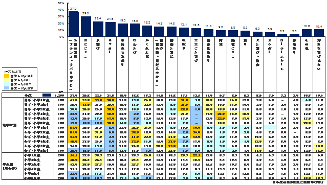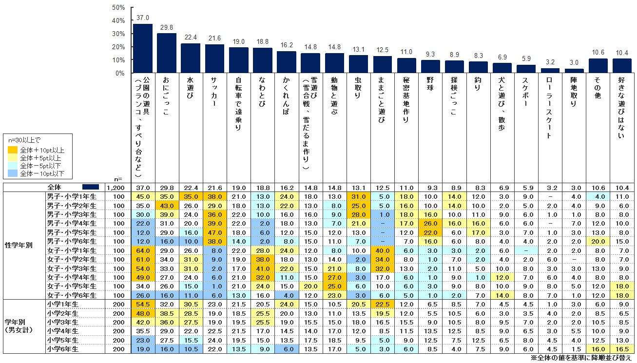 全学年では、1位「公園の遊具(ブランコなど)」(37.0%)、2位「おにごっこ」(29.8%)、3位「水遊び」(22.4%)、4位「サッカー」(21.6%)、5位以下が「自転車で遠乗り」(19%)、「なわとび」(18.8%)、「かくれんぼ」(16.2%)、「雪遊び」(14.8%)と続く。