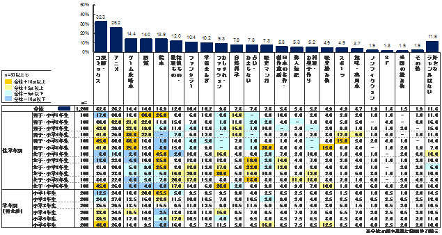 小学生が好きな本・雑誌のジャンルは、1位「漫画・コミックス」(32.3%)、2位「アニメ」(26.2%)、3位「ゲーム攻略本」(14.4%)、4位「図鑑」(14.0%)、5位「絵本」(13.9%)と続く。