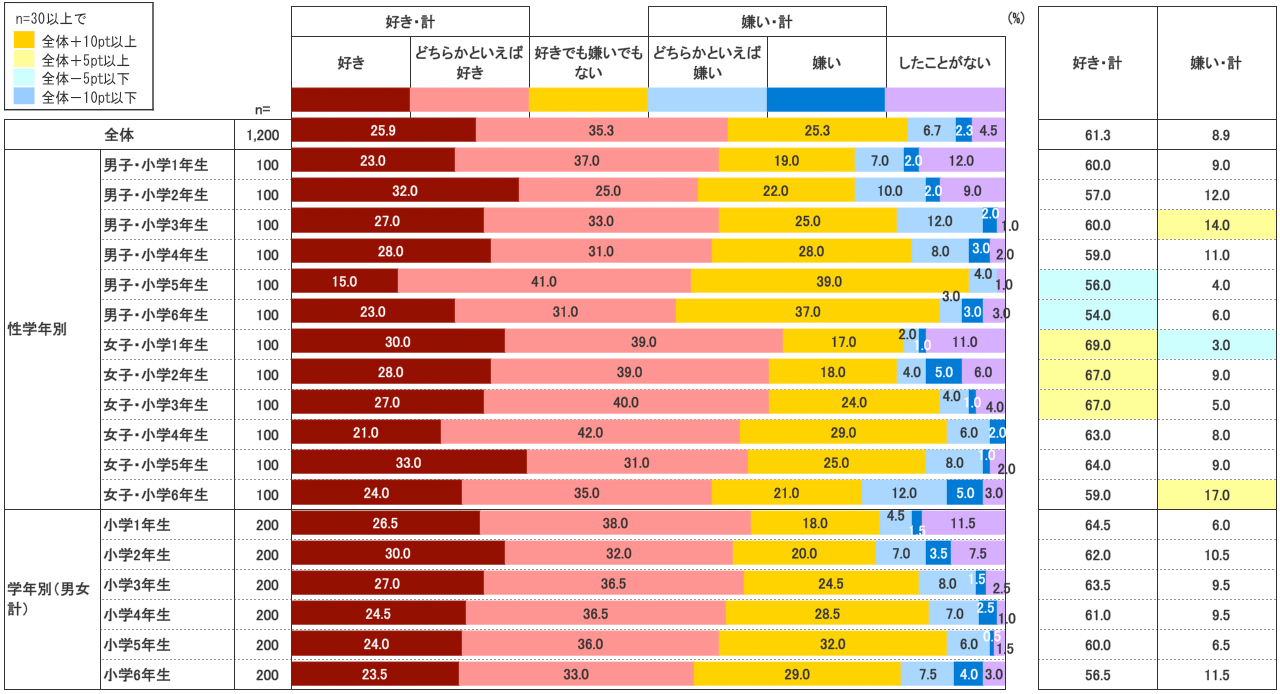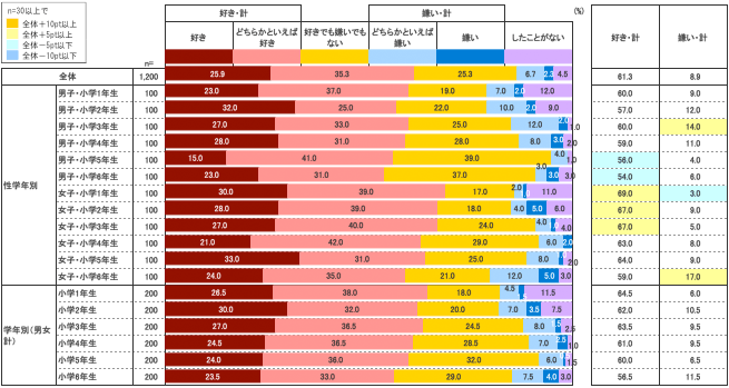 男女別にみると、1~5年生の女子は『好き・計』が全体平均を上回るが、男子については1~6年生において『好き・計』が全体平均を下回る。