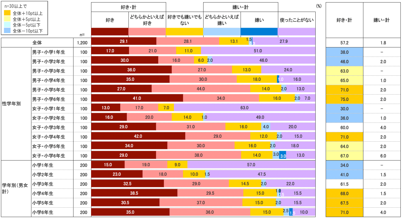 「好き」「どちらかといえば好き」の回答率は学年に比例して上昇する傾向にあるが、低学年ほど回答率が低いのは「使ったことがない」の割合が多いためで、使ったことのある子は、「好き」「どちらかといえば好き」が多数だった。