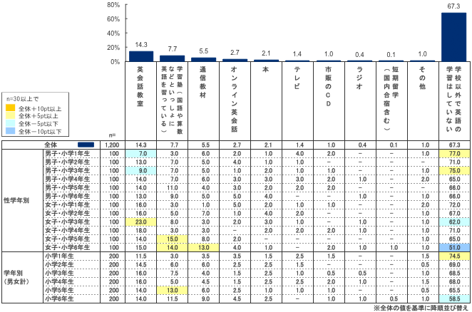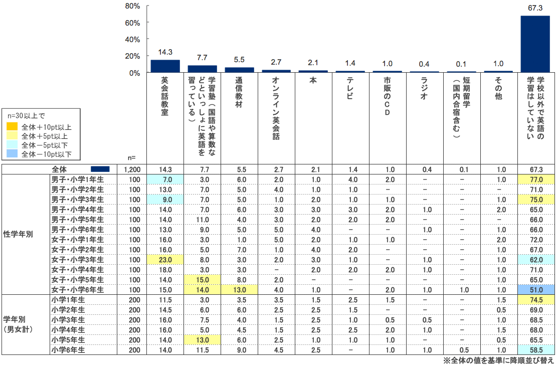 これを見ると、最も割合が高いのは「学校以外で英語の学習はしていない」(67.3%)であった。小学生の英語学習については近年、学習塾や小学生対象の英会話教室などが目立つが、実際に学校外で何かしらの英語学習をしている小学生は現在のところ33.7%にとどまった。