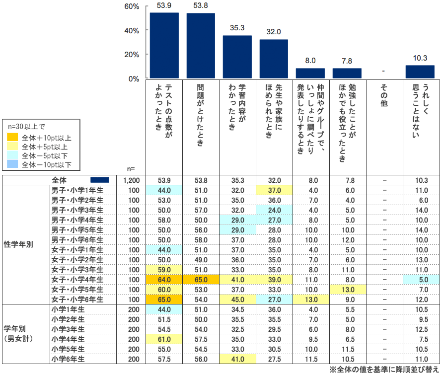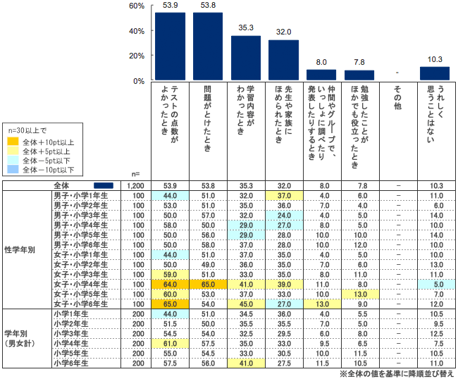 1位「テストの点数がよかったとき」(53.9%)、2位「問題がとけたとき」(53.8%)、3位「学習内容がわかったとき」(35.3%)、4位「先生や家族にほめられたとき」(32.0%)などの結果が出た。