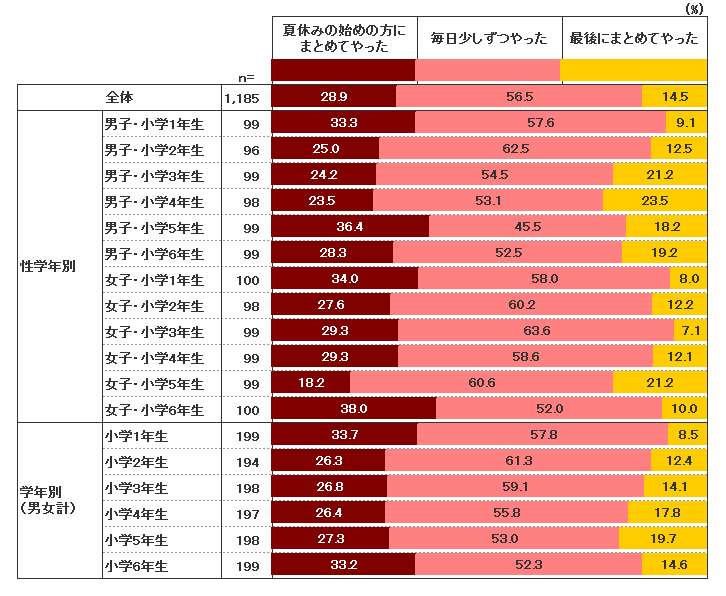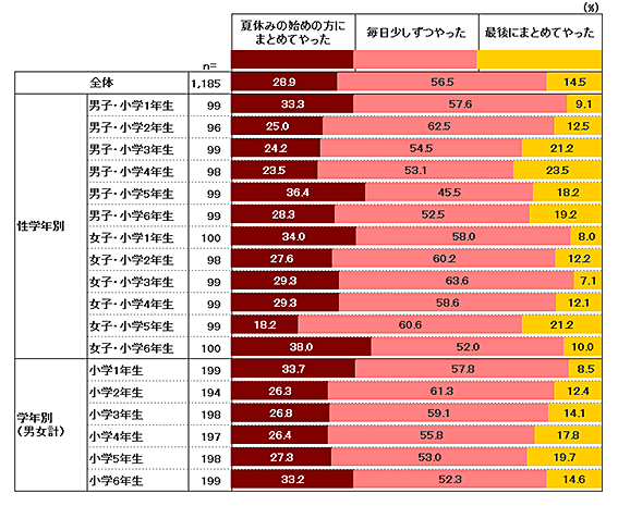 夏休みの宿題を少しでもやった子に対して、「あなたは、夏休みの宿題をいつやりましたか。」と聞いた結果が【図45】である。「夏休みの始めの方にまとめてやった」(28.9%)と「毎日少しずつやった」(56.5%)を合わせると85.4%の小学生が計画的に宿題に取り組んでいることが分かる。一方で、夏休み最後にまとめて終わらせる “駆け込みタイプ”は14.5%と少数派という結果になった。近年、目標を達成するためのモチベーションを維持し続ける力が注目されているが、小学生の頃の習慣は大人になってからの姿勢にも少なからず影響するといえよう。そういう意味では、今回の結果は肯定的に受け取れるのではないだろうか。さらに深めるのであれば、計画性や毎日コツコツ続ける姿勢を維持するために、どのような要因が働いているのか気になるところである。