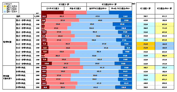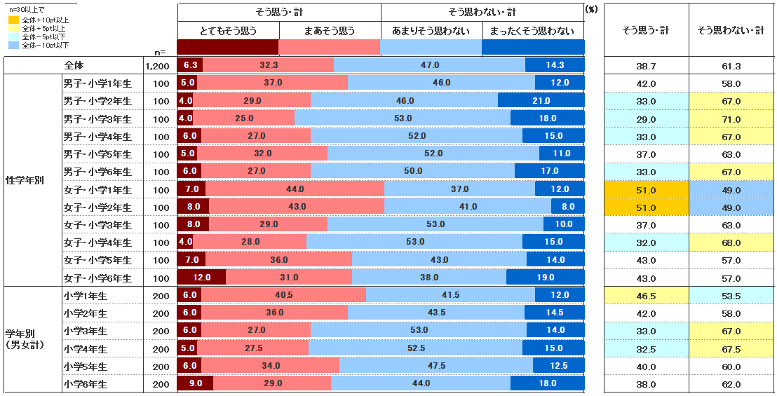 男女・学年別で「そう思う」の割合を見ていくと、1、2年女子が共に51.0%と最も高く、一方で男子は1年生が42.0%と最も高いことから、学校の授業だけで十分と考えているのは女子の保護者に多い傾向があるといえるだろう。