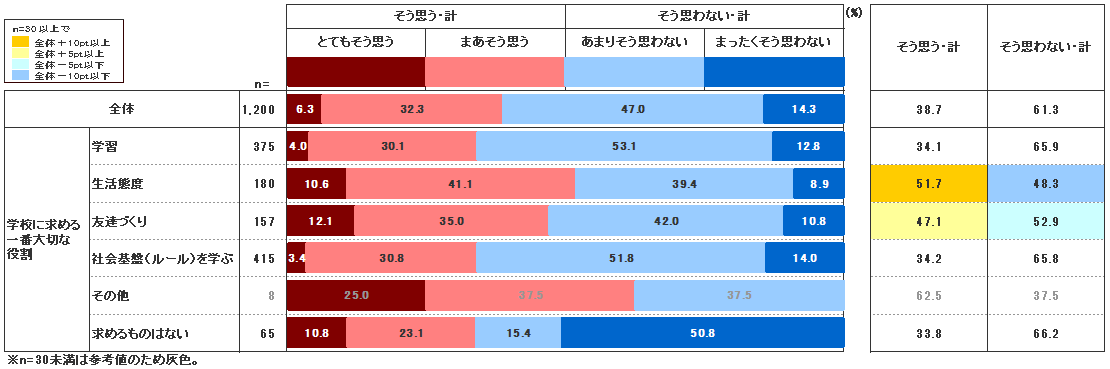 保護者が学校に求める役割によって、学校の授業への満足度には差があるのだろうか。「学校の授業に対する満足度」とのクロス集計を見ると、「学校に求める一番大切な役割」で「学習」を選んだ保護者は、学校の授業に満足しているかという質問に「あまりそう思わない」(53.1%)と回答した割合が最も多く、「まあそう思う」(30.1%)が続く。「とてもそう思う」と「まあそう思う」をあわせると34.1%となり、満足度は低い傾向にある。全体としては、「生活態度」「友達づくり」を選んだ保護者の満足度は5割程度であり、「学習」「社会規範(ルール)を守る」を選んだ保護者の満足度は約3割という結果になった。