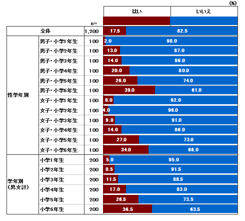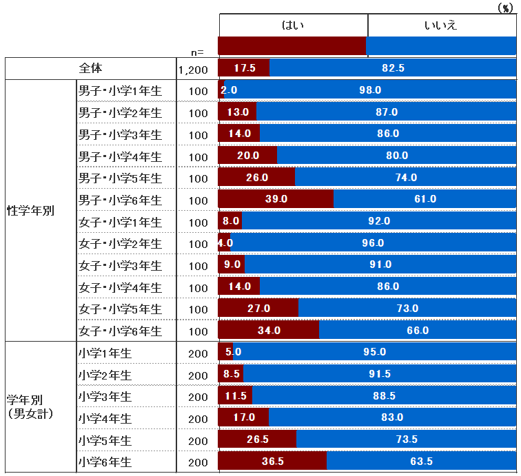 2015年より、選挙権年齢が20歳以上から18歳以上に引き下げられたが、小学生にその影響はあるのだろうか。学校で選挙について学んだのは全体で17.5%で、2割以下であった。男女とも最大値になるのは6年生で、男子は39.0%、女子は34.0%である。ともに1年生から6年生へとなだらかに増加する傾向がある。5年生では、26.5%が学校で選挙について学んでいる。