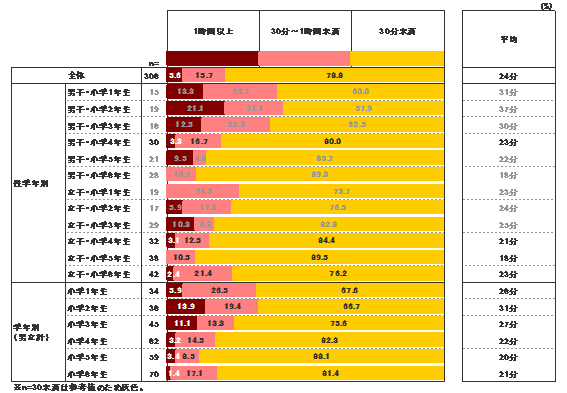 【図5】は、後述の通信機器に関する質問でラインやメールを利用していると答えた子どもに対して、1日の利用時間を尋ねたものである(回答数306)。それによると全体の平均時間は24分、時間別では30分未満が78.8%となった。一方で1時間以上と答えたヘビーユーザーが5.6%も存在しているところにも注目したい。