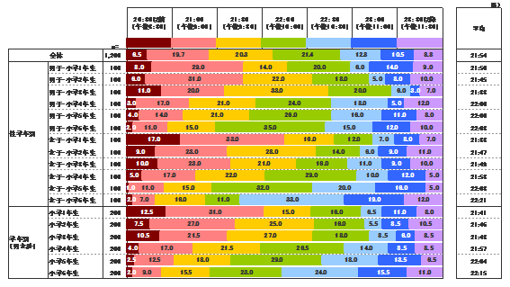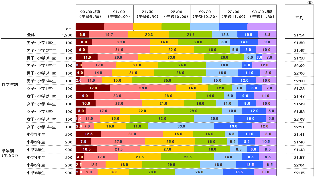 日本人の生活は、年々夜型になっているといわれるが、それは子どもの生活でも同様であることが数字となって現れた。平均就寝時間は21時54分で、これは2015年の調査 の結果とほとんど変化はない。しかし、22時までに就寝する子どもの割合を過去の調査と比較したところ、2010年が88.8% 、2013年 が71.9%だったのに対し、2016年は67.9%と割合が減っていることから、夜型が年々進んでいる実態が浮かび上がった。また本年の調査では、23時30分以降に寝ると答えた子どもが8.8%、つまり約100人も存在していた。厚生労働省の「健康づくりのための睡眠指針2014」※1では、10代前半の子どもが健康を維持するために必要な睡眠時間を8時間以上としており、登校時間を考えると、これらの子どもが寝不足なのは明らかだ。子どもの睡眠問題は深刻度を増していると言わざるをえない。なお、22時以降起きている子どもがなにをして過ごしているかについては、「午後10時から寝るまでの過ごし方」の項をご参照いただきたい。