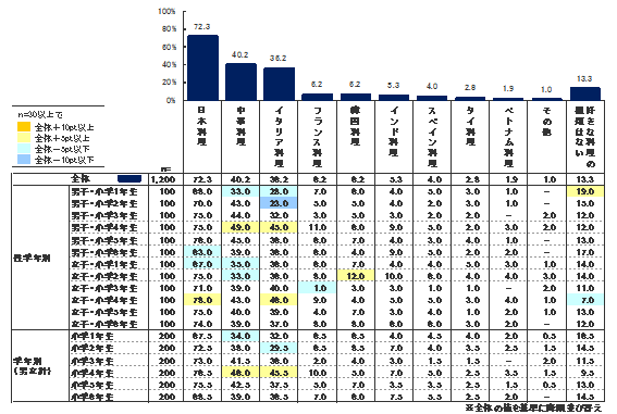 小学生の食文化が多様化しているといわれるが、数世代前に比べて世界各国の料理が身近になった昨今、小学生の食文化に対する好みはどのようになっているのだろうか。「あなたの好きな料理の種類はなんですか。」(複数回答可)の結果が【図9-1】である。今年の調査によると、断トツで日本料理が72.3%と人気が高く、次いで中華料理が40.2%、イタリア料理が36.2%と続いた。これら3位までの結果は他の料理の種類と比べて人気に大きな差が出る結果となった。このことから、小学生を取り巻く食文化は依然として日本料理が主軸を担っているということがわかる。その理由として、日本料理は世代を通して引き継がれているとともに、日本料理や中華料理、イタリア料理は、他の料理の種類と比べて材料の入手や調理の敷居が低いということも考えられる。今後さらに小学生の生活文化が多様化するにつれて食文化の好みにどのような変化が見られるのか興味深い。