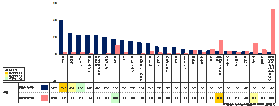「おすし」が好きと答えた割合が40.0%である一方で、「さしみ」が嫌いと答えたのは10.3%という結果は興味深いが、「おすし」の好きと嫌いの差が37.3ポイントであることに対して「さしみ」の好き嫌いの差は7.2ポイントと少ない特徴が見られる。