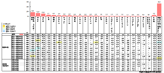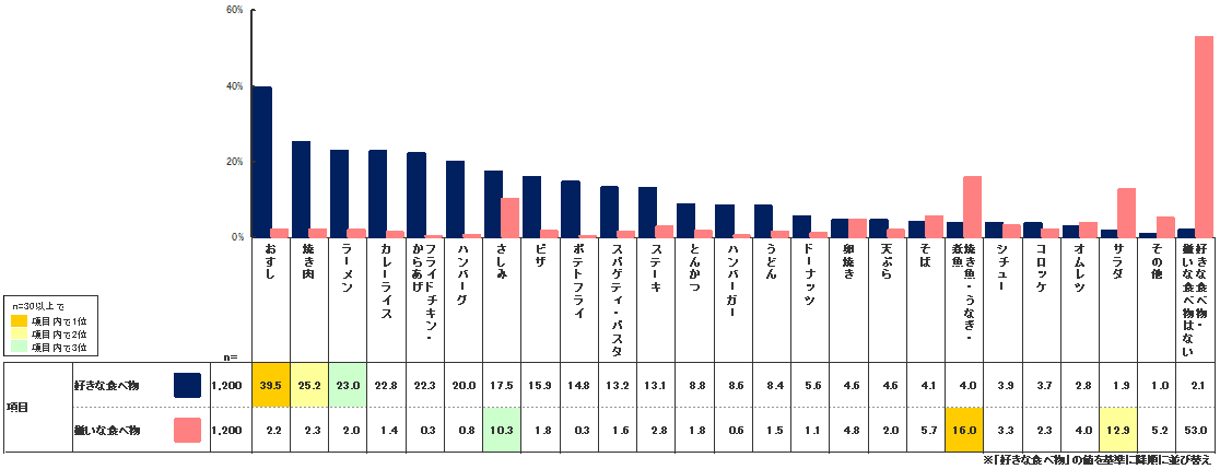 昨年との大きな違いは、昨年はサラダ(16.8%)が「嫌いな食べ物」1位だったのに対し、今回調査では「焼き魚・うなぎ・煮魚」(16.0%)が1位となっている点である。その原因の一つとして「焼き魚」に「うなぎ」と「煮魚」を加えたことの影響が考えられる。日本料理の人気の高さを考慮すると裏腹な結果と思われるが、その分日本料理の人気を牽引している要素として「おすし」の影響が大きいものと考えられる。