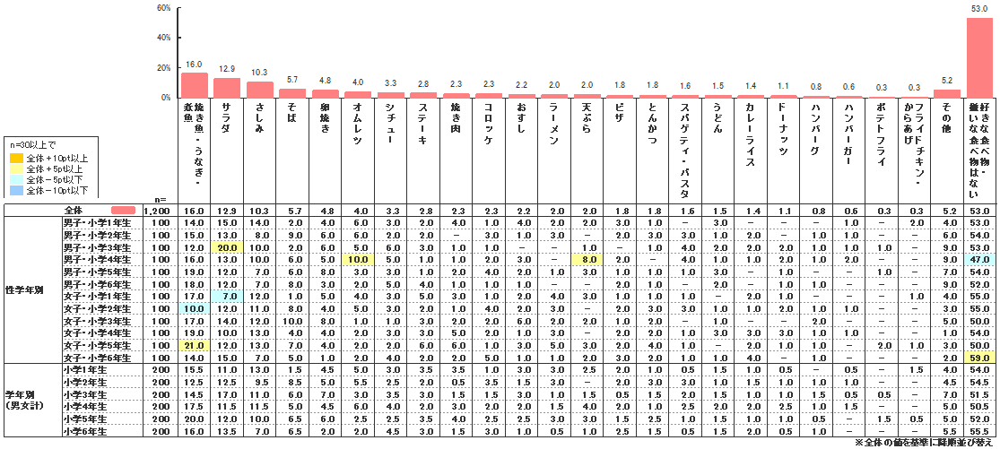 嫌いな食べ物については、「嫌いな食べ物はない」が53.0%と最も高く、次いで「焼き魚・うなぎ・煮魚」(16.0%)、「サラダ」(12.9%)、「さしみ」(10.3%)と続いた。2015年調査結果と比較しても「嫌いな食べ物はない」(45.6%)が1位であることに変動はなく、相変わらず小学生の約半数は「好き嫌いはない」と答えている。特に6年生女子は男子、女子他学年と比べて59.0%と最も高い割合となった。