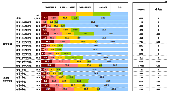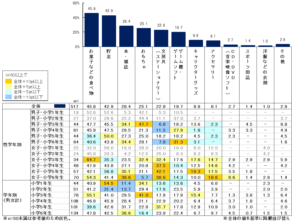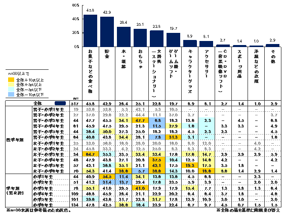 一方で、男女で大きな差が見られた項目もある。例えば「おもちゃ」「ゲーム機・ゲームソフト」は男子に多くみられ、「文房具」「キャラクターグッズ」などは女子に集中している。男子の方が比較的高価な物を、女子の方が低額な小物を買っていることが分かる。