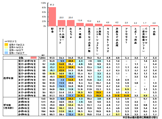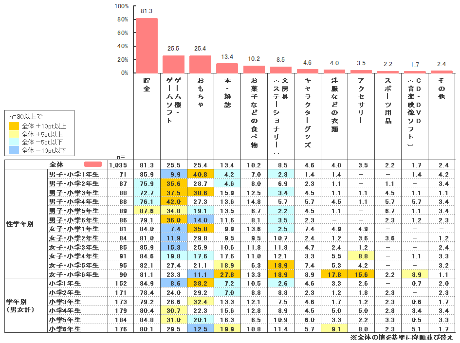 これを見ると、81.3%もの小学生が堅実に貯金に回していることが分かる。お年玉で買ったものの中で多いのが「ゲーム機・ゲームソフト」(25.5%)、「おもちゃ」(25.4%)といった比較的高額のものだったところから考えると、臨時収入で、普段は高価で買えないホビー用品などを買い、自らの楽しみに充てている子が多いようだ。