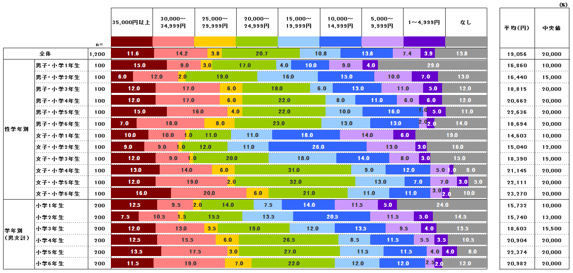 2016年の小学生のお年玉平均金額は19,056円。昨年の同調査によると、2015年の平均金額は17,578円であったことから、約1,500円の増額ということになる。「0(もらっていない)」は13.6%で、低学年、特に1年生では24.0%と4人に1人がお年玉はもらっていないと回答した。