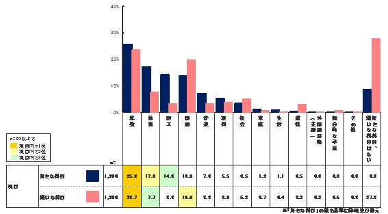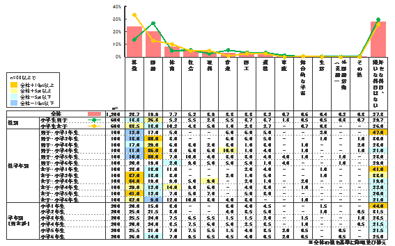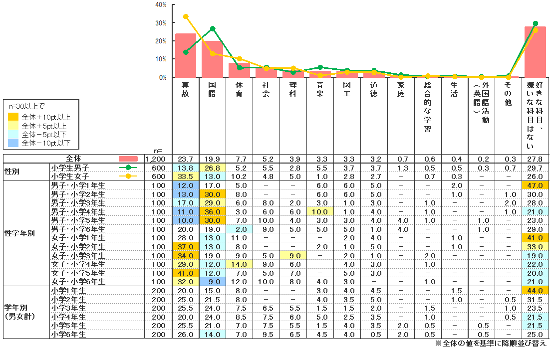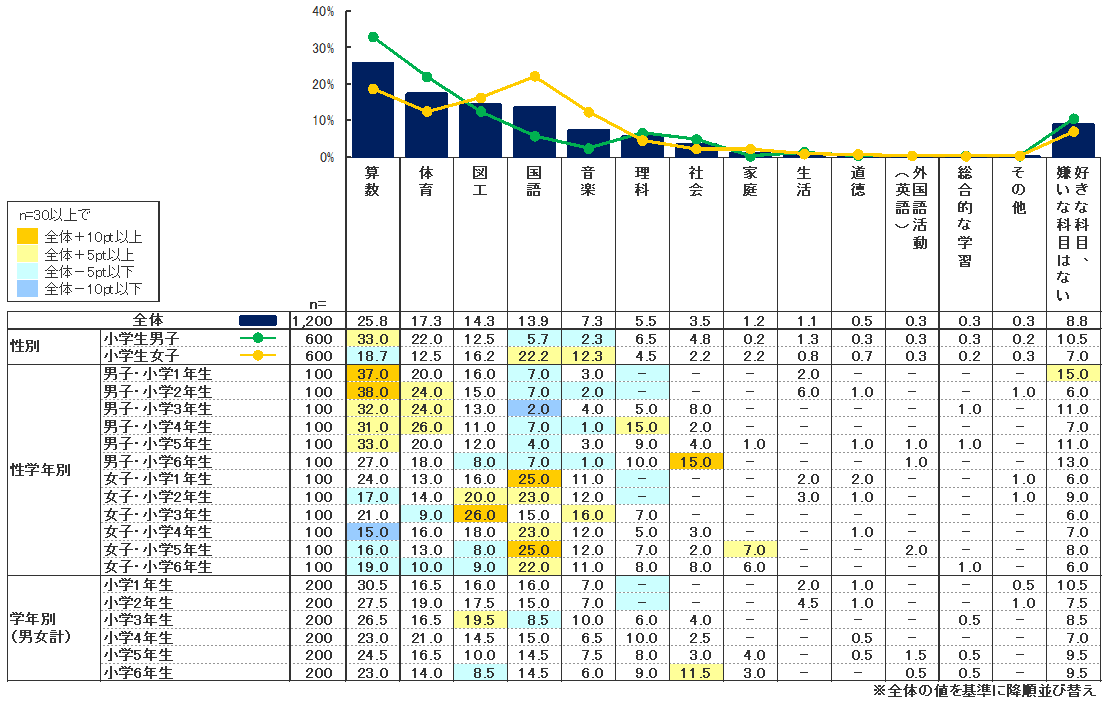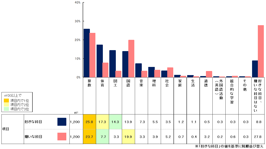 「算数」が「好き」(25.8%)と「嫌い」(23.7%)の差は僅か2.1ポイントと少ないことから、好き嫌いは顕著に二分していることが分かる。男女別に見ると、男子が「算数」を好きと答えている割合(33.0%)が高く、女子では18.7%と大きな差が開いた。さらに、算数を嫌いと答えた男子の割合が13.8%であるのに対し、女子は33.5%とこちらも明確な差が見て取れる。一方で、「国語」については男女の好き嫌いが「算数」と逆転している。「国語」を「好きな科目」と答えた男子は5.7%であるのに対し、女子は22.2%。「国語」を「嫌いな科目」と答えた男子は26.8%であるのに対して、女子は13.0%であった。このようなことから、嫌い・不得意といった先入観の壁を乗り越えられるような工夫や機会がさらに必要であるといえる。