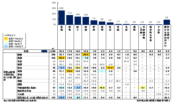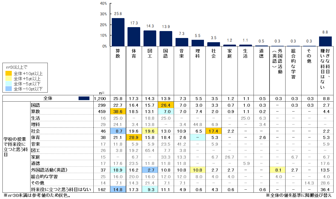 「算数」(38.6%)は「役に立つ」し「好き」であると答えた小学生が最も多いことが分かった。また、次いで「体育」(28.9%)、「国語」(26.4%)となった。この結果から、「将来役に立つ」と思っている子の方が、その科目が好きである割合が高いことが読み取れる。この傾向は、母数は少ないものの「体育」(28.9%)「社会」(17.4%)にも見られる。一方で、「将来役に立つと思う科目はない」と答えている子が「好きな科目はない」と答えている割合は36.4%いることも明らかになった。