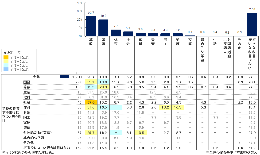 「将来役立つと思う科目」と「嫌いな科目」の関係を調べた結果が【図16-3】である。ここから、「将来役立つと思う科目」として「社会」を選んだ子は「算数」が嫌いである割合(37.0%)が高いことが明らかになった。このことは、「国語」や「体育」、「外国語活動(英語)」を選んだ子にも同様のことが言える。また、「将来役に立つと思う科目」として「算数」を選んだ子は「嫌いな科目」として「国語」を選ぶ割合が高く、一方で「将来役に立つと思う科目」で「国語」選んだ子は「嫌いな科目」として「算数」を選んでいることが分かった。ここでも文系と理系という括りの二項対立が見られるが、そもそもそのような括りで科目を分けた見方をすること自体が、小学生の抱くイメージに影響を与えている可能性も考えられる。相互に関係していない科目はなく、1つの教科で学ぶことは他の全ての教科で活かせると考える姿勢を大切にしていく必要があるのかもしれない。