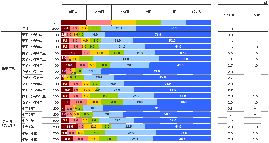 小学生が1か月に読む漫画の全体平均は1.8冊で、2015年10月調査の2.1冊から0.3冊減少した。2015年10月調査では設問に「雑誌」を含めることを明記していなかったため、今回は平均値が上昇することが考えられたものの、予想に反する結果となった。読書離れは漫画にも及んでいるといえる。