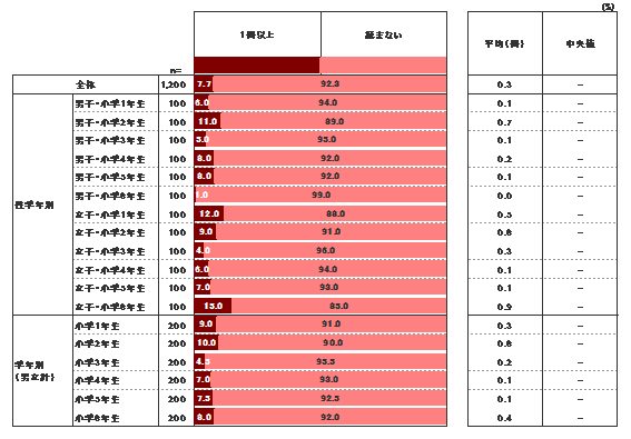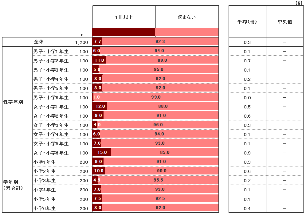 1か月の平均数は0.3冊、電子書籍を「読まない」と回答した子が全ての学年で90%以上に上った。ただし、2015年10月調査では、1か月に1冊以上電子書籍を読む子が10%を超えたのは6年生女子のみだったのに対して、今回は6年生女子に加え、2年生男子、1年生女子も10%を超えている。定額制の電子書籍配信サービスなども登場していることから、保護者の電子書籍利用率の上昇にともなって小学生も電子書籍に触れる機会が増える可能性がある。今後も調査を継続していく必要があるだろう。