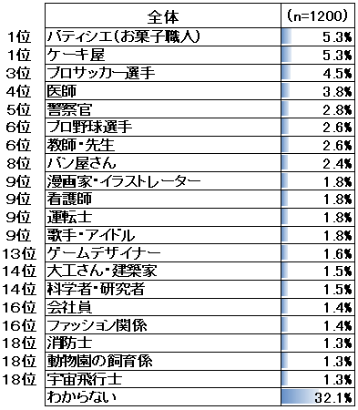 以下には、3位のプロサッカー選手(4.5%)、6位のプロ野球選手(2.6%)などのプロスポーツ選手、4位の医師(3.8%)、9位の看護師(1.8%)などの医療系従事者、4位の警察官(2.8%)、6位の教師・先生(2.6%)などが続く。