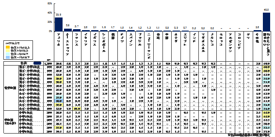 次に、海外渡航経験があるなしに関わらず、「あなたが行ってみたいと思う外国はどこですか。以下の中からあてはまるものを1つ選んでください。」と質問した結果が【図34】である。こちらから提示したのは表中にある22項目だが、それ以外に「その他(自由記述欄に記入)」「行きたいと思う国はない」を設けた。