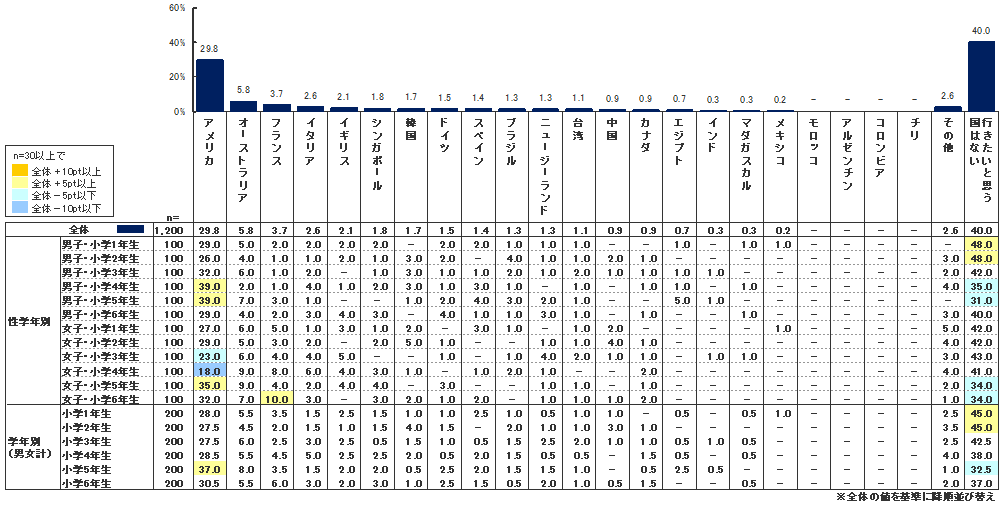 その結果、もっとも多かった回答は「行きたいと思う国はない」の40.0%であった。小学生の意識はあまり海外には向いてないようだ。2013年の同調査では、行きたい国は「なし」と答えたのは23.5%で、1位の「アメリカ」(34.7%)を下回っていたことを考えると、グローバル化はむしろ後退しているようにも思える。