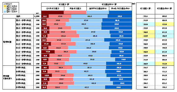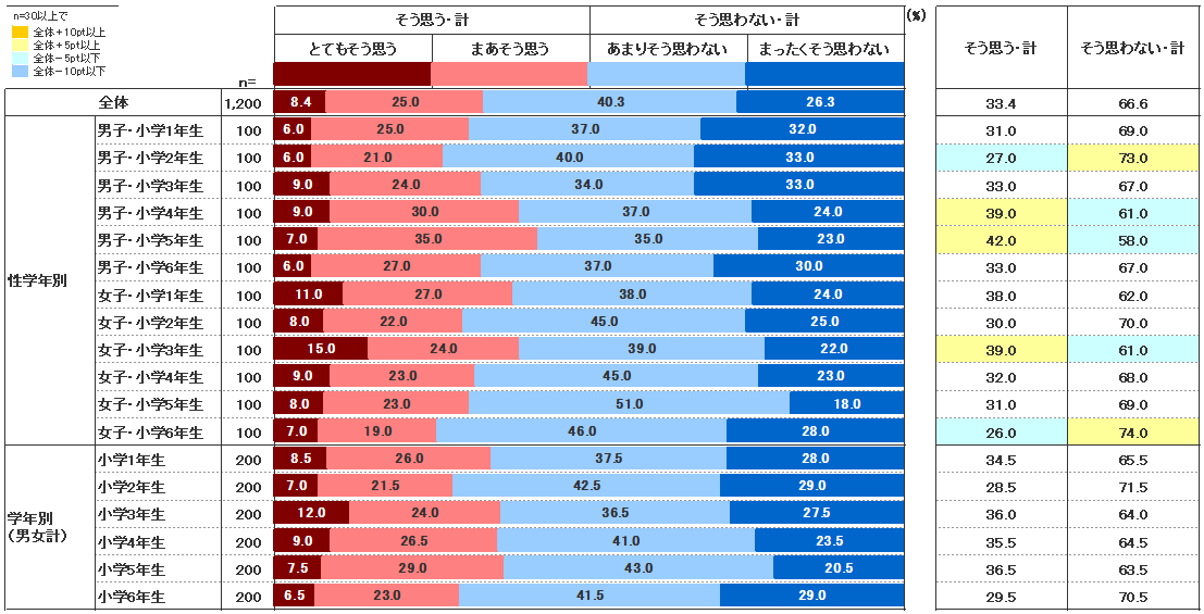 「留学したい・計」「留学したくない・計」をそれぞれ分析してみると、「留学したい」と答えたうち積極的に留学したいと思っているのは8.4%(「とてもそう思う」)、「留学したくない」と答えたうち、まったく留学したくないと思っているのは26.3%(「まったくそう思わない」)と、「留学したくない」と強く思う小学生の方が多いことが分かった。