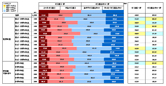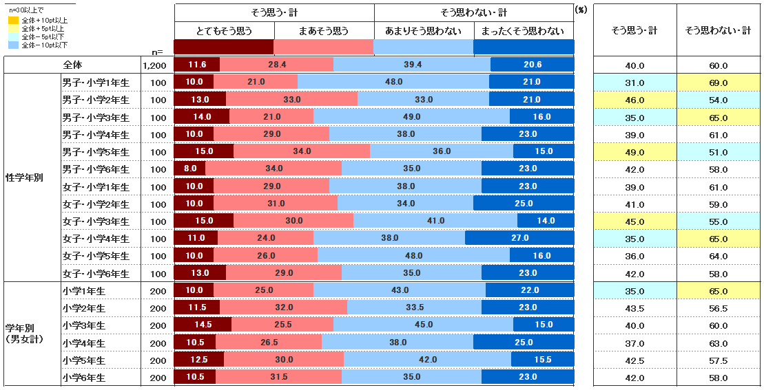男子5年生が49.0%、女子2年生43.5%とピークはあるが、学年や性別による差は大きくないといえるだろう。また、「とてもそう思う」は全体の11.6%で、男女学年を通して8.0~15.0%と2割以下であることがわかる。