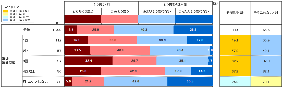 また、「海外渡航回数4回以上」に注目してみると、「留学したい・計」は67.9%ともっとも高い反面、2~3回海外渡航経験のある子に比べて「まったく留学したいと思わない」と答えた子がかなり増える(14.3%)ことがわかる。これは、海外に対する「なんとなく楽しい」という意識が、何度も海外への渡航を経験することで変わってくるのではないかと考えられる。