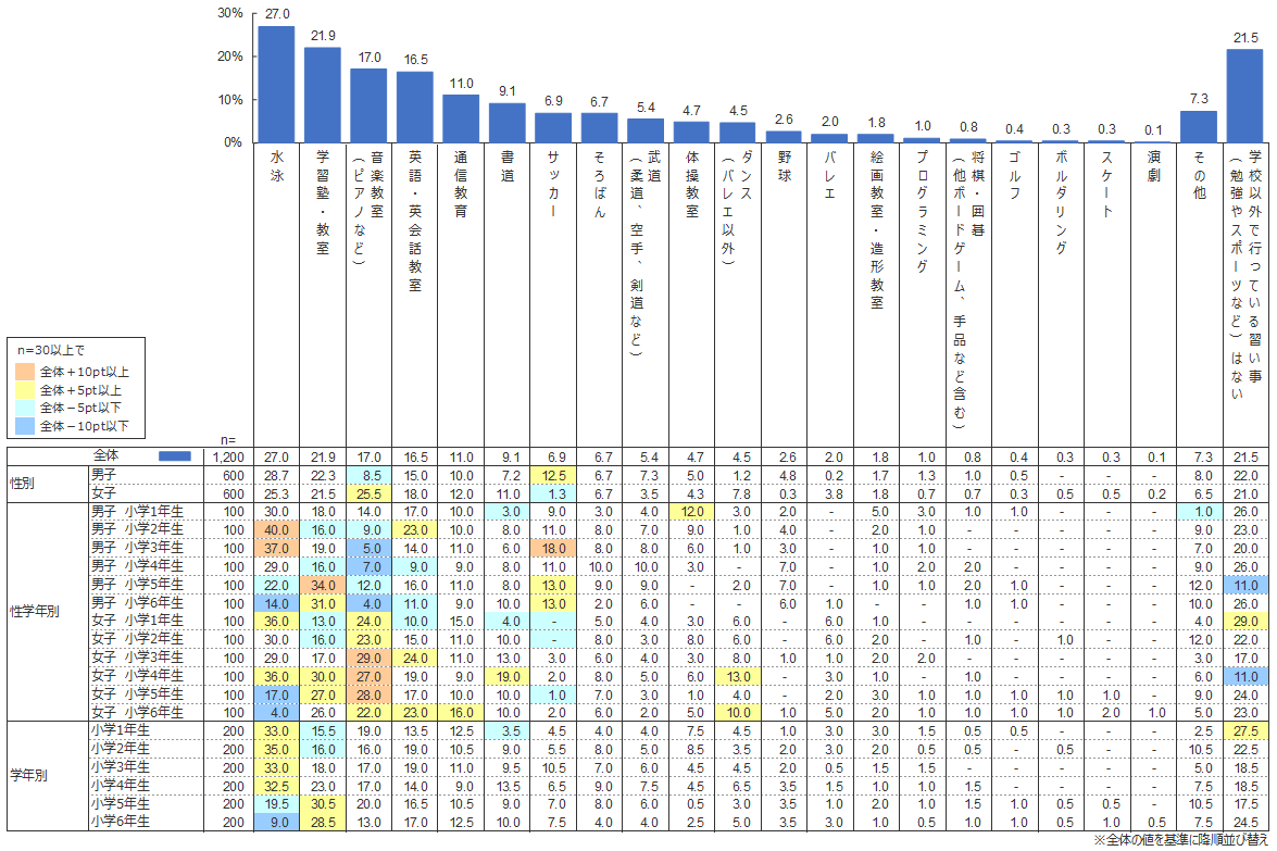 小学生の78.5%、ほぼ5人に4人は通信教育を含む何らかの習い事をしていることがわかった。中でも最も人気がある習い事は、幼児の調査 (1位「水泳」(14.0%))と同様「水泳」(27.0%)であった。1〜4年生では3人に1人が「水泳」を習っており、特に1・2年生では男女を問わず他の習い事を引き離して人気がある。しかし、学年が上がるにつれて5年生で5人に1人、6年生では11人に1人と減っていくことから、「水泳」人気は主に低学年に支えられていることがわかる。この特徴は2014年度調査 でも同様であった。