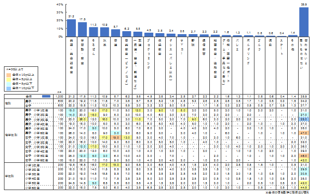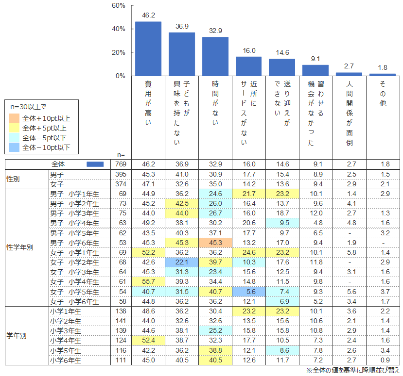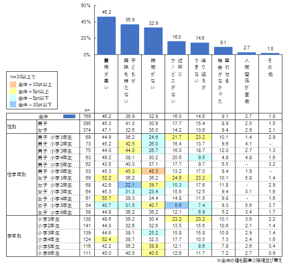 最も多い理由は「費用が高い」(46.2%)ことであった。「時間がない」(32.9%)という回答も3割を超えている。特に5・6年生ではその傾向が強く、高学年の子どもたちの忙しい様子もうかがえる。一方、保護者がやらせたくても「子どもが興味を持たない」場合も3割以上(36.9%)であり、これも「時間がない」と同様に5・6年生に多くみられる傾向である。