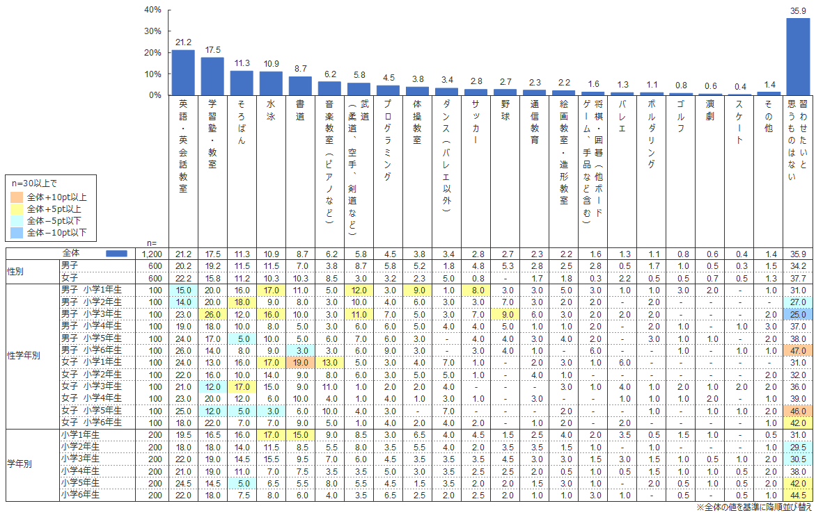 保護者が習わせたいと思っている習い事の1番人気は「英語・英会話教室」(21.2%)であった。これは全ての学年でトップであり、男女別では若干女子の方が高い。小学生が実際に行っている「習い事」調査 を見ると、すでに16.5%の小学生が「英語・英会話」を習っていることから、本項目の潜在層を合計すると37.7%となる。学校教育において2020年度から5・6年生で英語が教科化され、3・4年生から「外国語活動」が導入されることを考慮すれば、この割合は今後さらに高くなると考えられる。また、学習塾でも小学生向けの英語のカリキュラムが増えてきており、英語を学ばせたい保護者にとっては、「英語・英会話教室」以外の選択肢が増えることもあり得る。また、この特徴は「プログラミング」についても同様のことがいえる。