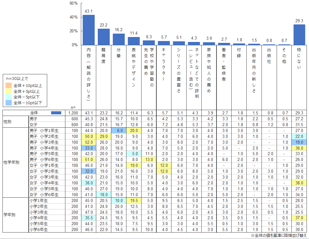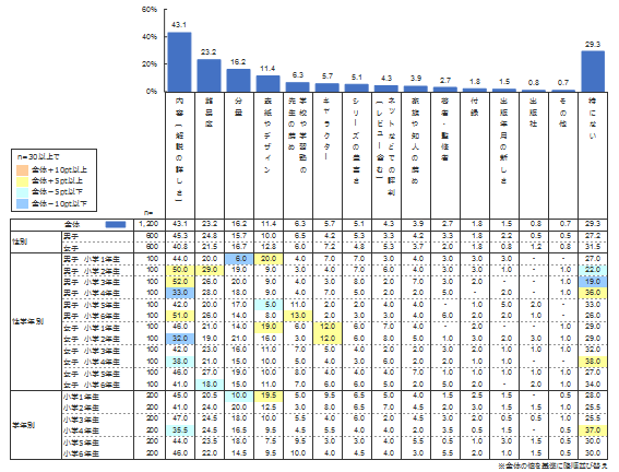 男女別では、1~3年生・男子で「内容」を重視するという結果が半数近くになっている。低学年のうちは、詳しい解説でしっかりと理解させたいという保護者の思いが表れた結果であろうか。 学年別では、1年生で「表紙やデザイン」を重視するという回答が20%近くあり、逆に「分量」を重視するという回答(10.0%)は、全学年平均(16.2%)より6%以上少なかった。このことから、1年生はとっつきやすさを重視する傾向にあると考えられる。