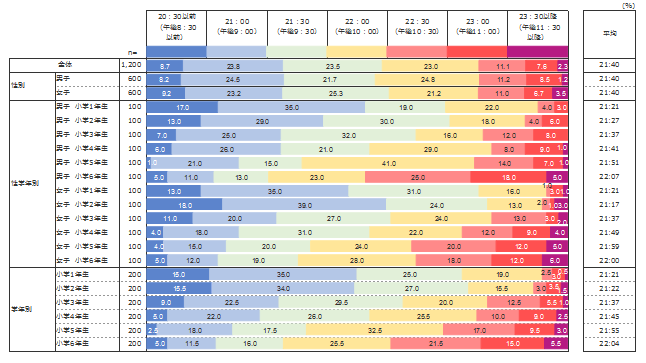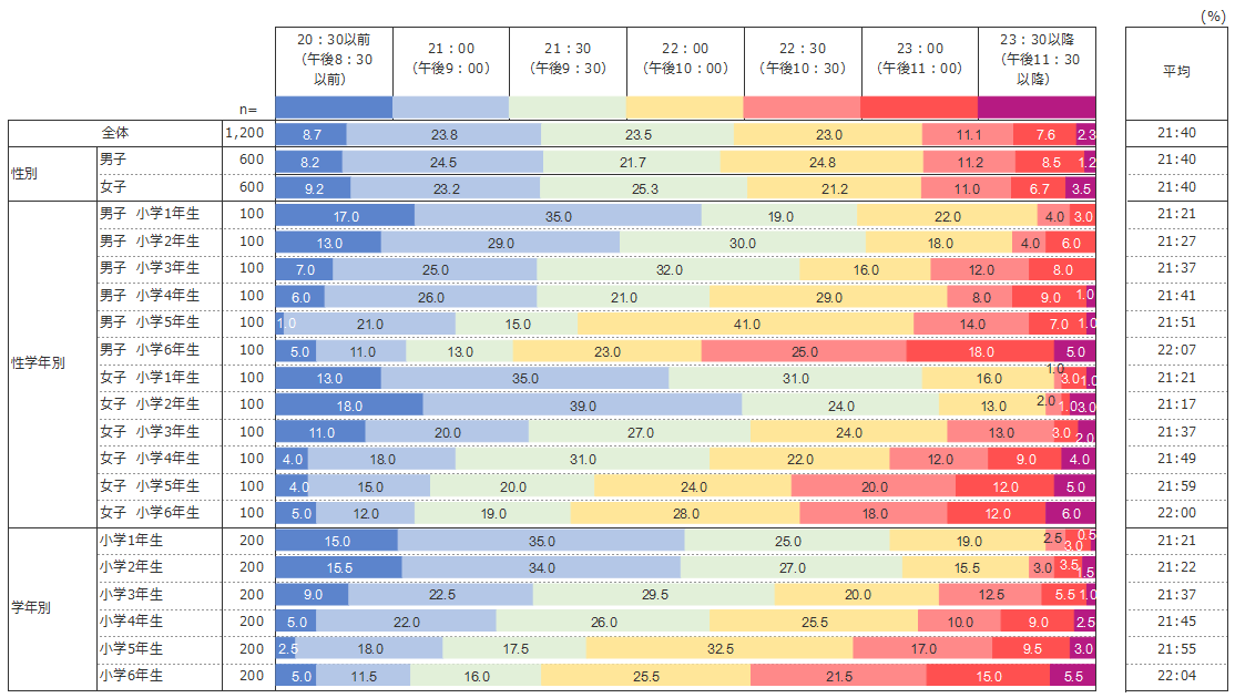 昨今、子どもの生活リズムが夜型になりつつあることが指摘されているが、小学生は普段何時頃に寝ているのだろうか。