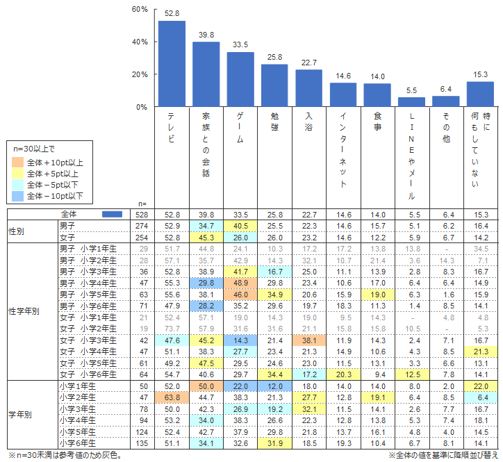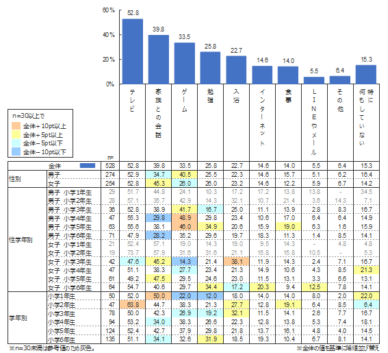 結果をみると、最も多いのが「テレビ」(52.8%)、次に「家族との会話」(39.8%)、「ゲーム」(33.5%)と続くことが明らかになった。