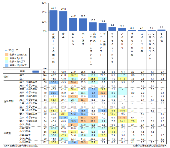 おこづかいの使い道の1位は「お菓子などの食べ物」(44.1%)、次いで「貯金」(42.0%)、「おもちゃ」(27.9%)の順となる。「おもちゃ」は1年生では51.1%とダントツであるが、学年が上がるにつれて減少し、6年生では15.6%となる。これと逆の傾向を見せるのは「本・雑誌」で、1年生では17.0%なのが、6年生では38.5%と倍以上になる。また、「文房具(ステーショナリー)」にも「本・雑誌」と同様の傾向が見られる。「洋服などの衣類」「スポーツ用品」の割合はどの学年でも低く、比較的高額な商品は保護者が購入している可能性がある。