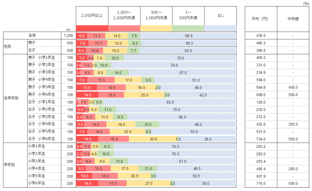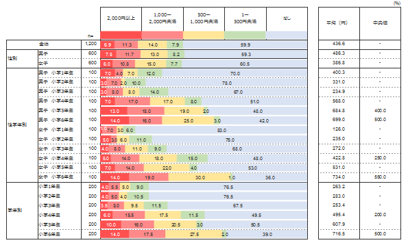 おこづかいの平均金額は小学生全体で436.6円であり、金額は学年とともに上がる傾向が見られる。一方、毎月の決まった額のおこづかいは「なし」と答えた子どもは約60%と過半数を占め、ここ3年の調査では増加傾向にある。ただ、学年が上がるにつれてもらっていない子どもの割合は減り、1年生では76.5%が「なし」であるのに対して、6年生では39.0%に半減する。