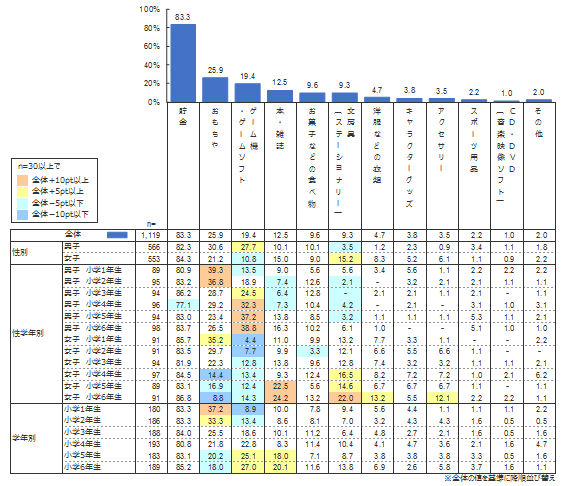 「貯金」(83.3%)がダントツの1位で、次いで「おもちゃ」(25.9%)、「ゲーム機・ゲームソフト」(19.4%)の順となった。男女別に見ると、男子では「ゲーム機・ゲームソフト」が27.7%(女子10.8%)、女子では「文房具(ステーショナリー)」が15.2%(男子3.5%)と、用途に偏りが見られる。特に6年女子の「洋服などの衣類」は13.2%と高く、6年男子の1.0%と比べて、身だしなみなどに気を遣う女子の姿が垣間見える。