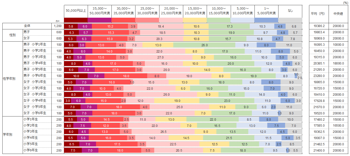 調査の結果、お年玉を「もらっている」と回答した子どもは全体の93.2%となり、その平均総額は19,386円であった。2015年度 の平均総額は17,578円、2016年度 は19,056円であり、この3年で増加傾向にあるといえる。特に、低学年での金額増が目立ち、2016年度と比べて1年生が1,748円、2年生が1,845円増えている。全体として、お年玉の金額は、おこづかい同様、学年が上がるにつれて増加する傾向がみられる。