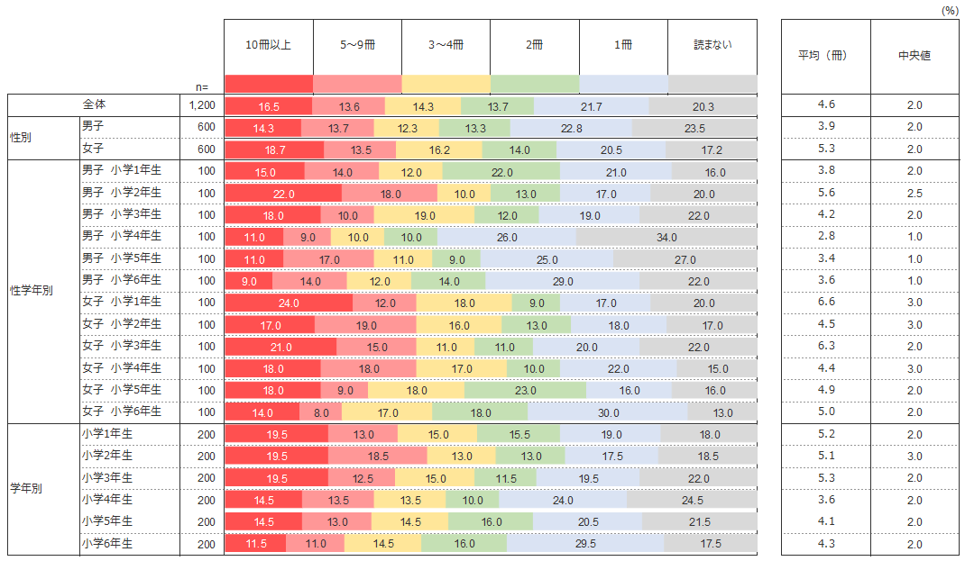 2016年度調査 時は小学生の読書量の減少傾向が続いていたが、今回の調査結果では4.6冊となり、2016年度調査時と比較すると0.3冊増加しており、およそ1週間に1冊読んでいるといえる。同様に(月に1冊も)「読まない」(20.3%)と回答した割合は2016年度調査時から5.6ポイント下がっていることから、本離れにややブレーキがかかっていると言えそうだ。