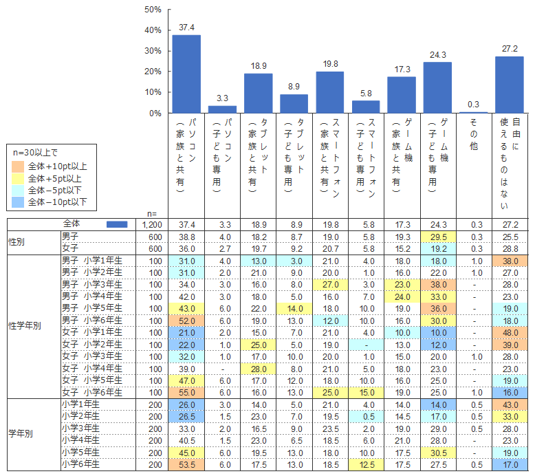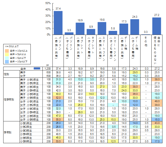 まず、家族と共用で使っているものとしては「パソコン」(37.4%)が最も多く、「スマートフォン」(19.8%)、「タブレット」(18.9%)、「ゲーム機」(17.3%)はほぼ同じ割合となっている。「パソコン」は、学年が上がるにつれて利用率も高まる傾向が見られ、6年生では53.5%と過半数になる。2016年度調査 では6年生のパソコンの利用率は40.0%であったことから、パソコンの利用率が増加していることがわかる。男女間での利用率にはほとんど差がみられない。