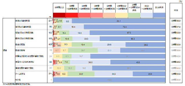 通信機器の利用目的別の利用時間を尋ねたところ、通信機器の利用目的で上位であった「動画の閲覧」「ゲームをする」が最も長い、1時間であった。次いで「学習サービスを利用する」(48分)、「趣味のための情報収集」(45分)と続く。