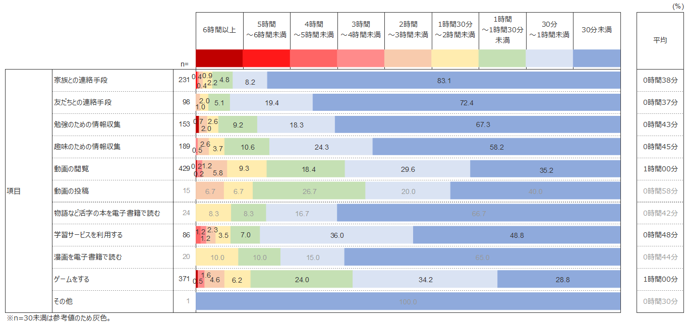 全体の平均利用時間は0時間57分で、2016年度調査 より8分増加、2015年度調査 より12分増加している。特に、「通信機器を利用していない」(32.6%)子どもも含め、30分未満と回答した子どもが2016年度調査よりも11.9ポイント減少している一方で、1時間半以上と回答した子どもは12.1ポイント増加していることがわかる。