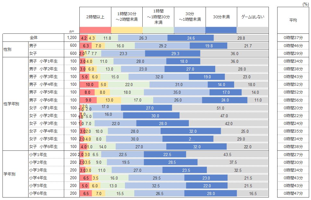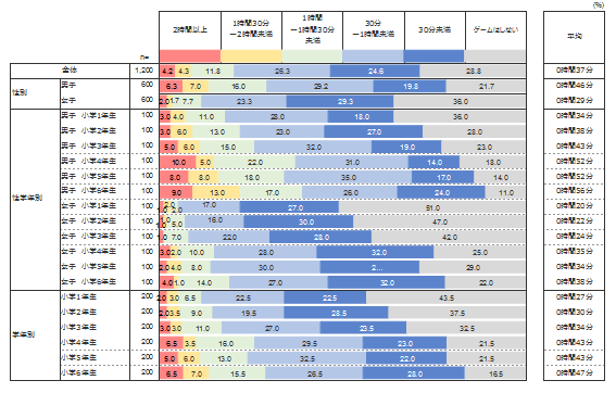 小学生白書の経年調査によると、子どもがゲームに費やす平均時間は、ここ数年減少傾向にある。2016年度調査(1日平均51分) と比べても、2017年は14分減の「0時間37分」という結果になった。「ゲームはしない」という子どもは28.8%で、2016年度の32.8%よりも4%減っている。これはゲーム時間が1時間未満の子どもの割合が2016年度調査時の51分より3.6%増加していることからもわかるように、ゲームそのものをする時間が減っていることが影響していると考えられる。また今回の調査では、1日にスマホなどの通信機器を利用する平均時間(1時間24分)が、2016年度調査結果(49分)よりも35分増えていることから、ゲームの時間がスマホなどの通信機器を使う時間に取って代わられている可能性がある。娯楽の中心がゲームであった時代から、スマホなどでの動画閲覧などを楽しむ時代へと変化してきているのかもしれない。(参考:「通信機器の利用目的」 )。